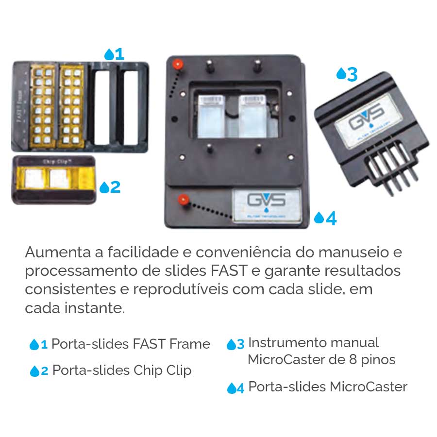 O MicroCaster é um sistema econômico de microarray manual de nível básico. Com o instrumento manual Microcaster de 8 pinos, as amostras podem ser carregadas a partir de placas de 96 ou 384 poços. O porta-slides MicroCaster aloja dois slides. Tem um sistema de indexação integrado que permite a impressão precisa de até 768 pontos em um array de 32 x 24 pontos. Está projetado para slides FAST de 1 almofada com dimensões de 20 x 51 mm e é compatível com outras superfícies de slides. Os acessórios MicroCaster podem ser usados para aumentar a flexibilidade do sistema de array manual, fornecendo uma indexação precisa da placa de origem e uma limpeza fiável do instrumento de pinos. O indexador de micro-placas MicroCaster é compatível com micro-placas standard de 96 poços e a estação de lavagem e blotting reduz o incômodo envolvido na limpeza do instrumento de pinos.